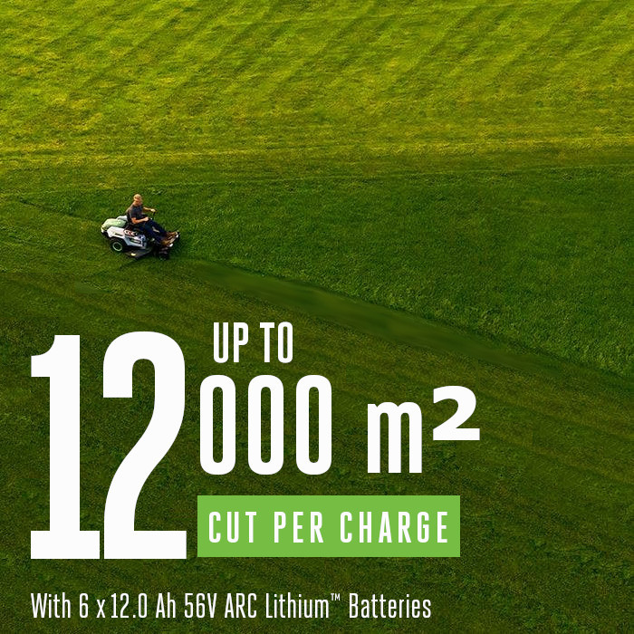 Klipper upp till 12000 m2 på en enda laddning med sex 12Ah -batterier. På de 40Ah som ingår klipps 8000m2. Helt utbyggbart, lägg bara till fler batterier för att klippa just den yta du behöver - till skillnad från alla andra batteridrivna ZTR på marknaden som inte har denna möjlighet.